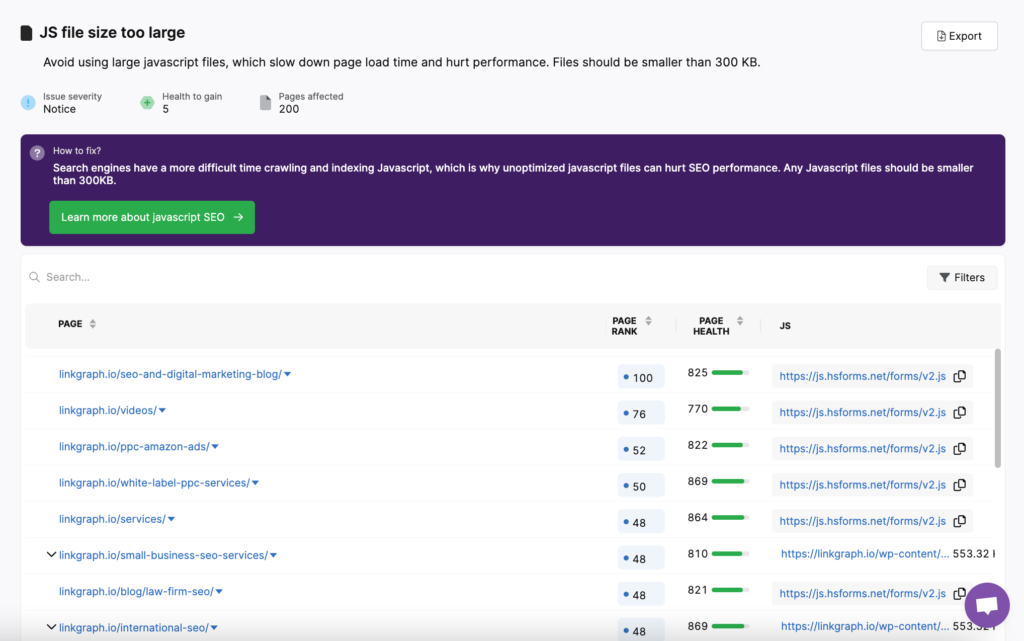 Because page performance is so important to ranking, the Search Atlas site auditor will flag pages with extra large Javascript files that are slowing down load times and responsiveness.