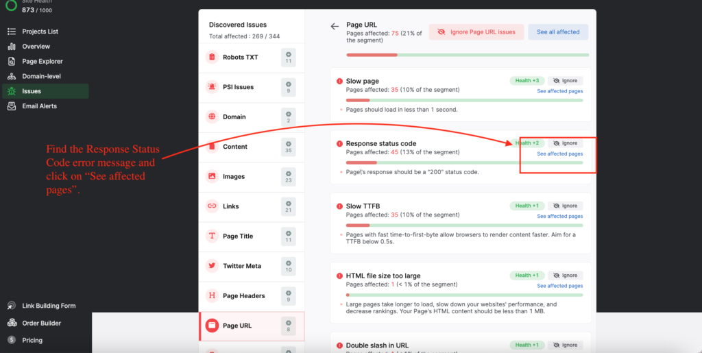 The Search Atlas Site Auditor will check the HTTP response codes of your webpages. It will also flag any issues it identifies in relationship to the status code.