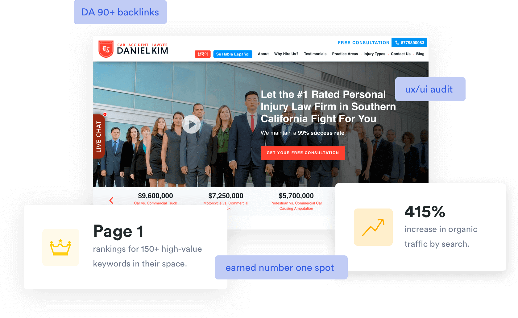 LinkGraph knew that focusing on local citations and geo-targeted link building would improve their visibility and help them rank higher than competitors in Southern California-based searches. LinkGraph also recognized limitations with the Law Offices of Daniel Kim’s website design, and knew that a more conversion-focused UI/UX could mean drastic improvements in sitewide conversions.